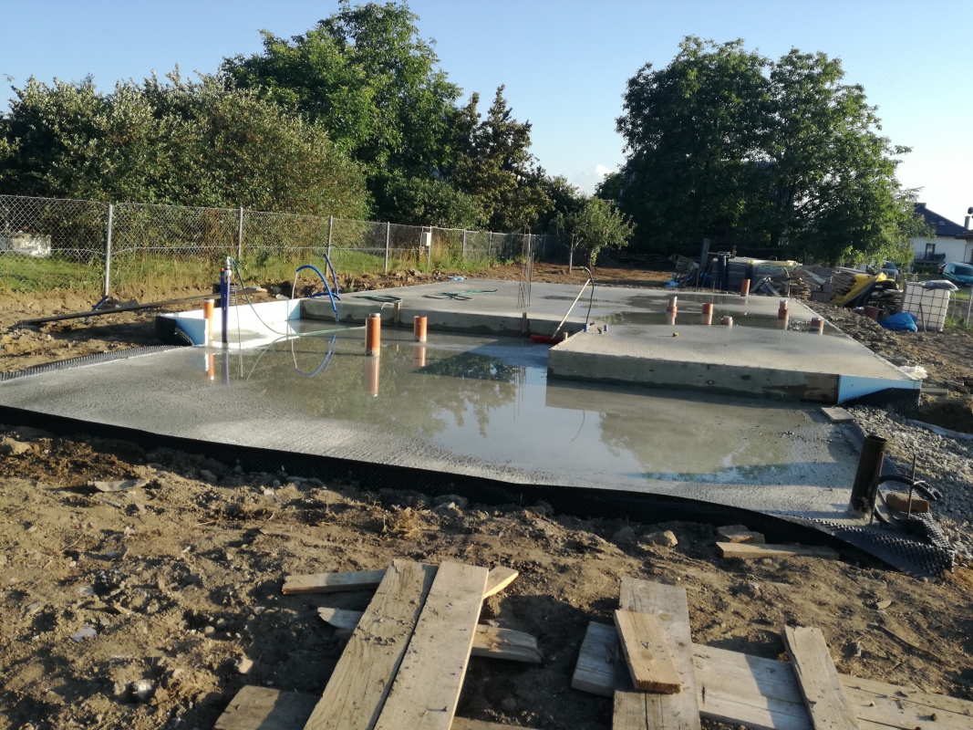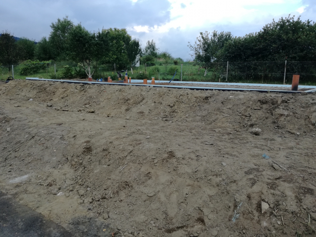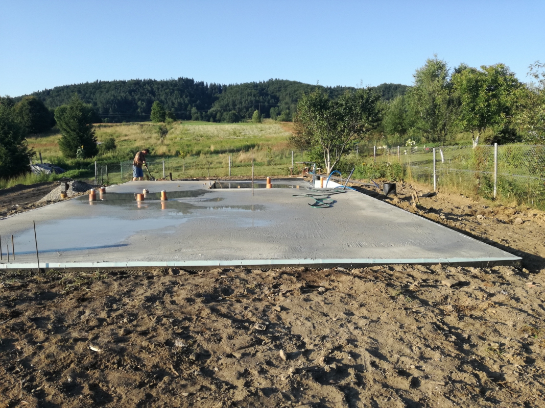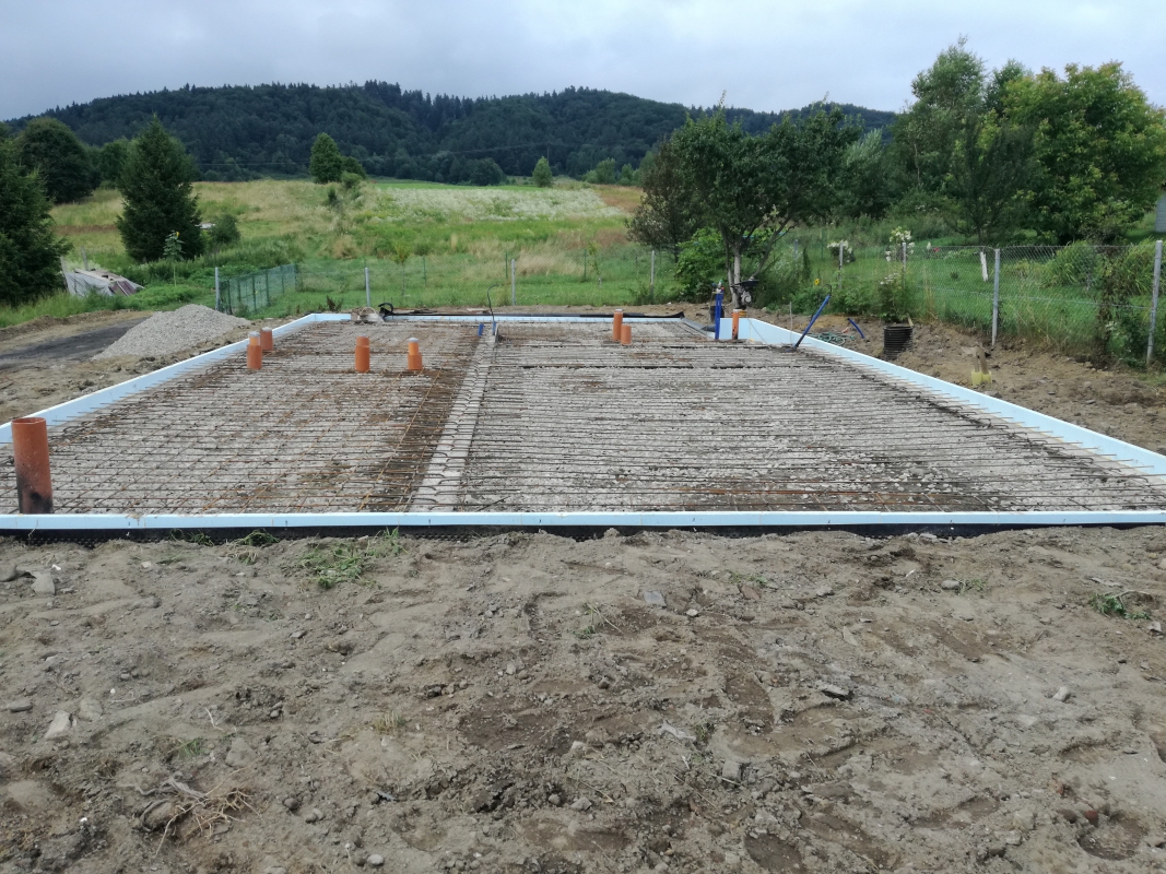 W między czasie po wykonaniu kanalizacji, drenażu, podciągnęliśmy do domu wodę, a elektrownia zrobiła dla nas przyłącz prądu. Ocieplenie fundamentów styrodurem zrobiliśmy sami, sami też rozłożyliśmy kanalizację wewnątrz domu i ułożyliśmy folię kubełkową. Oczywiście zasypywanie fundamentów od wewnątrz i zewnątrz, ubijanie skoczkiem (Paweł przez kilka dni nie mógł ruszać rękami) zrobiliśmy sami.